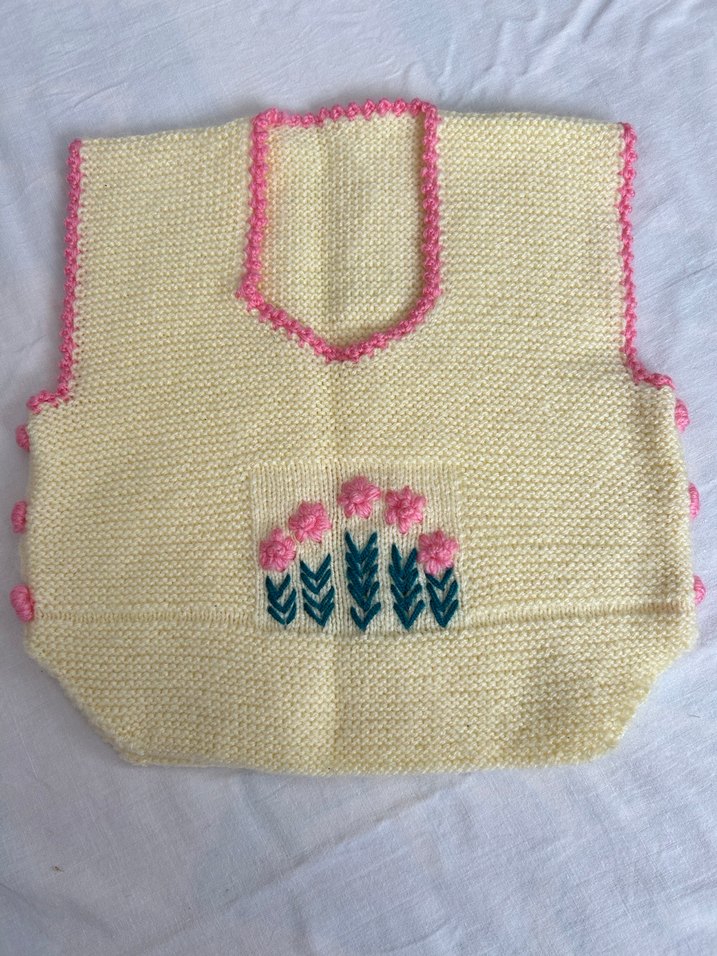 Kız çocuklar için bol kesim, kolsuz triko süveter. Yumuşak pastel renkte, çiçek nakışlı ve pembe detaylıdır.
