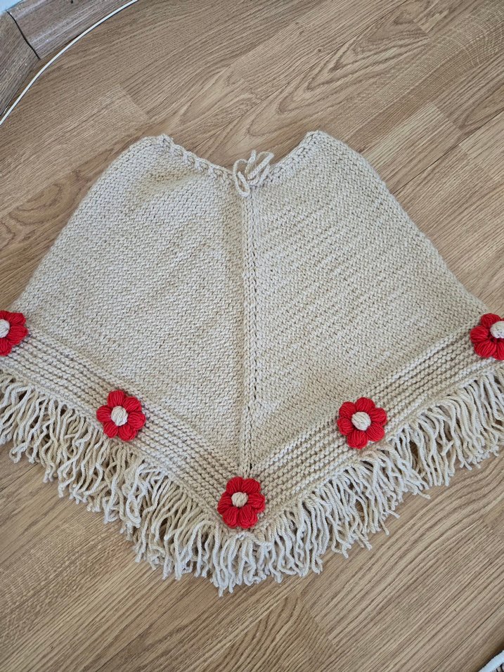 Nakışlı kırmızı çiçekler ve püsküllerle süslenmiş, gevşek kesim örgü kız çocuk pelerini. Bisiklet yaka ve askılı kollu, bohem tarzda. 3-4 yaş için