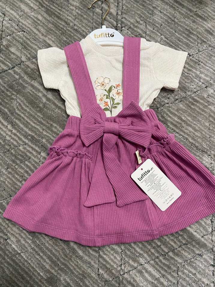 Kız çocuk elbise, kısa kollu ve bol kesimlidir. Yumuşak triko kumaştan yapılmış, mor askıları ve büyük fiyonk detayı vardır. Nakışlı çiçek desenleriyle bohem tarzda şık bir görünüm sunar.