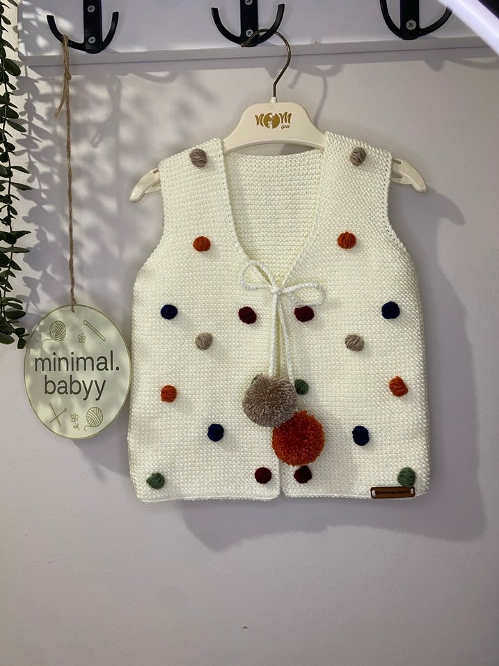 Bu beyaz triko yelek, bol kesim ve renkli nakışlı ponpon detaylarıyla bohem tarzı yansıtıyor.