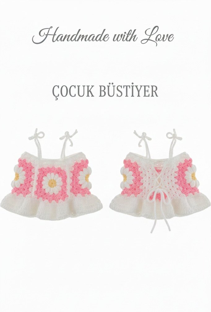 Nakışlı çiçek desenleri ve dantel detaylı, bol kesim kız çocuk bolero. Askılı, straplez yakalı, yumuşak örme kumaştan yapılmıştır. El yapımı, bohem tarzda.