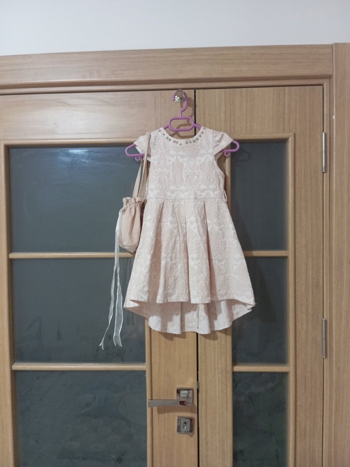 Kız çocuk için bej renkte, nakışlı dantelli, straplez ve bol kesim elbise. Yumuşak örme kumaştan, bohem tarzda ve pastel tonlarda.