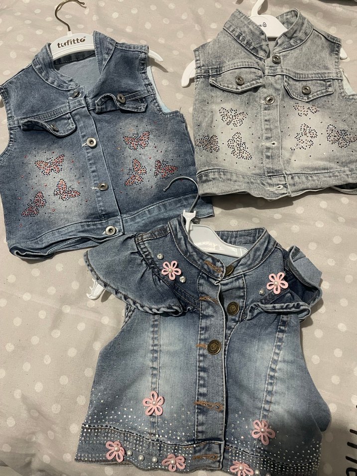 Düğmeli, nakışlı kelebek ve çiçek desenli, kolsuz, fitted kesim kız çocuk kot yelek, gri tonlarında.