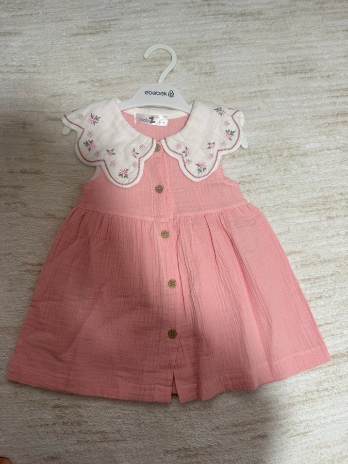 Düğmeli, yakalı, nakışlı beyaz yakası olan pembe pamuklu, kolsuz, bol kesim kız çocuk elbisesi. Bohem tarzda.