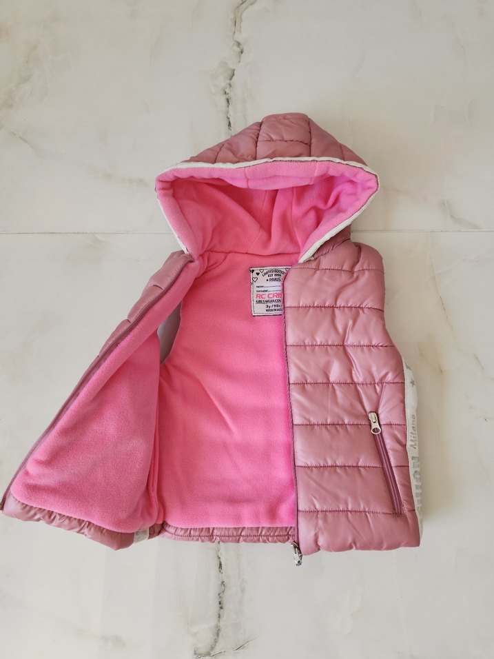 Kız çocukları için pembe, nakışlı, fermuarlı ve kapüşonlu yelek. İçi Polar kumaştır. Üst kalite bir üründür. 1/2/3/4/6