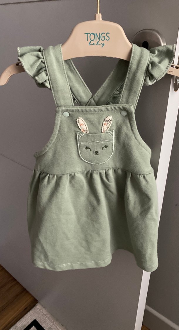 Kız çocuklar için nakışlı tavşan detaylı, fırfırlı askılı, yumuşak ve sıcak kumaştan kolsuz khaki elbise. Bisiklet yaka ve fitted kesim.