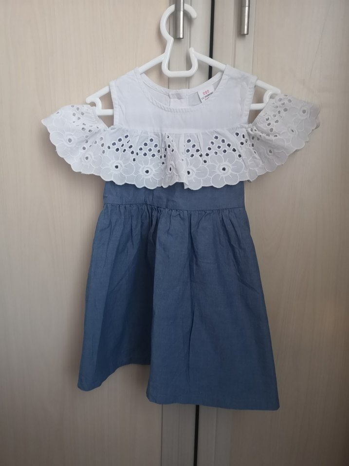 Kız çocuk elbisesi, beyaz nakışlı fırfırlı üst ve bol kesim etekten oluşur. Kolsuz ve askısız yakasıyla trend bir görünüm sunar.