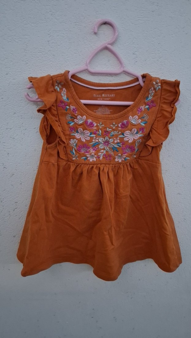 Kolsuz kahverengi elbise, renkli nakışlı çiçek desenleri, fırfır detaylar ve V yaka ile bol kesim bohem tarzını yansıtıyor. ISAAC MIZRAHI (yurtdışı)