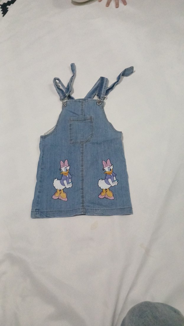 Nakışlı ve kemerli, ayarlanabilir askılı, renkli işlemeli kot kumaştan kız çocuk elbisesi, sokak stiline uygun.