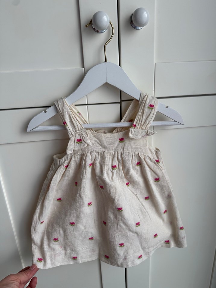 Kolsuz, straplez yaka ve fırfır detaylı kız çocuk keten elbise. Hafif beyaz renkte, nakışlı desenli ve bol kesim bohem tarzda.