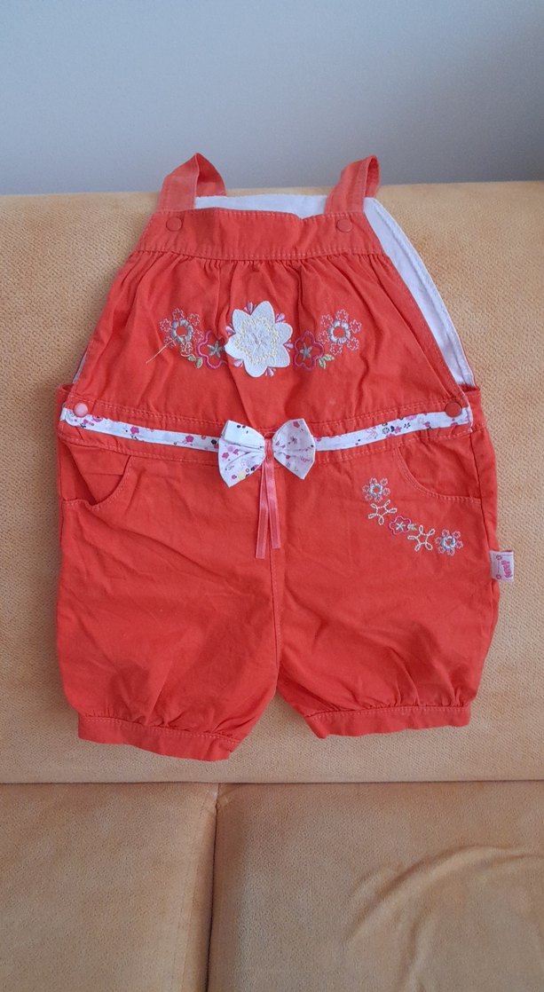 Canlı turuncu renkli, nakışlı ve dantelli, bol kesim askılı kız çocuk tulumu. Fiyonklu ve cepli detaylarıyla sokak stili için uygun.