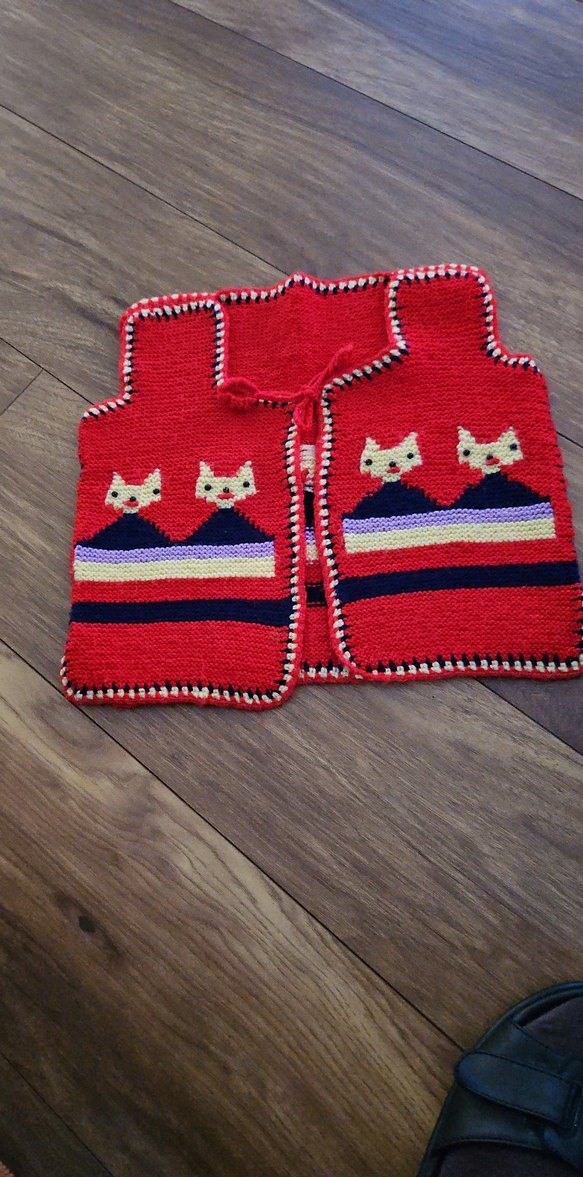 Kız çocukları için kırmızı, nakışlı ve fit kesim triko yelek. Kolsuz, bisiklet yaka ve bohem tarzda, sevimli kedi desenleri içerir.