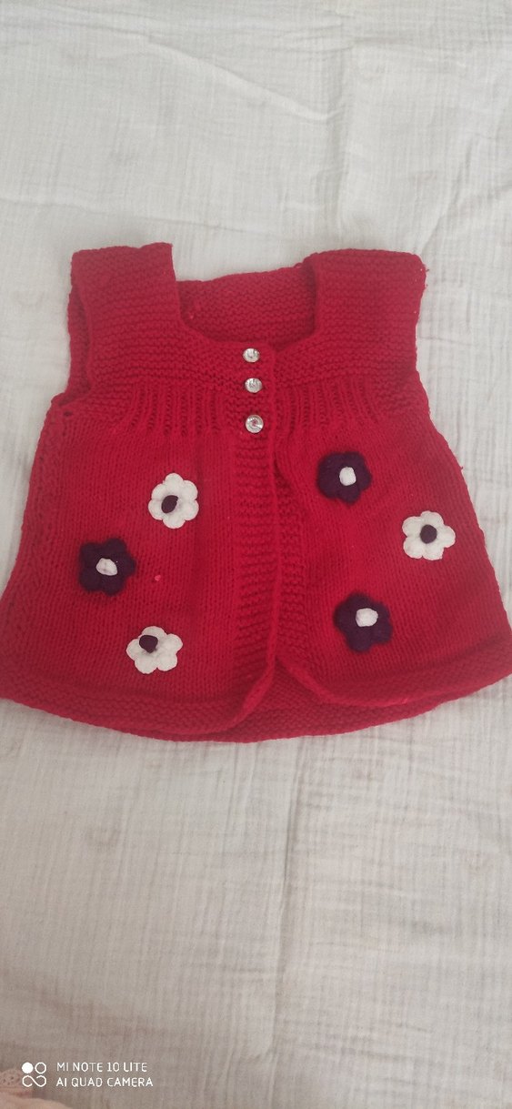 Renkli kırmızı örgü, nakışlı çiçek desenli, düğmeli, bohem tarzda, fitted kesim kız çocuk süveteri.