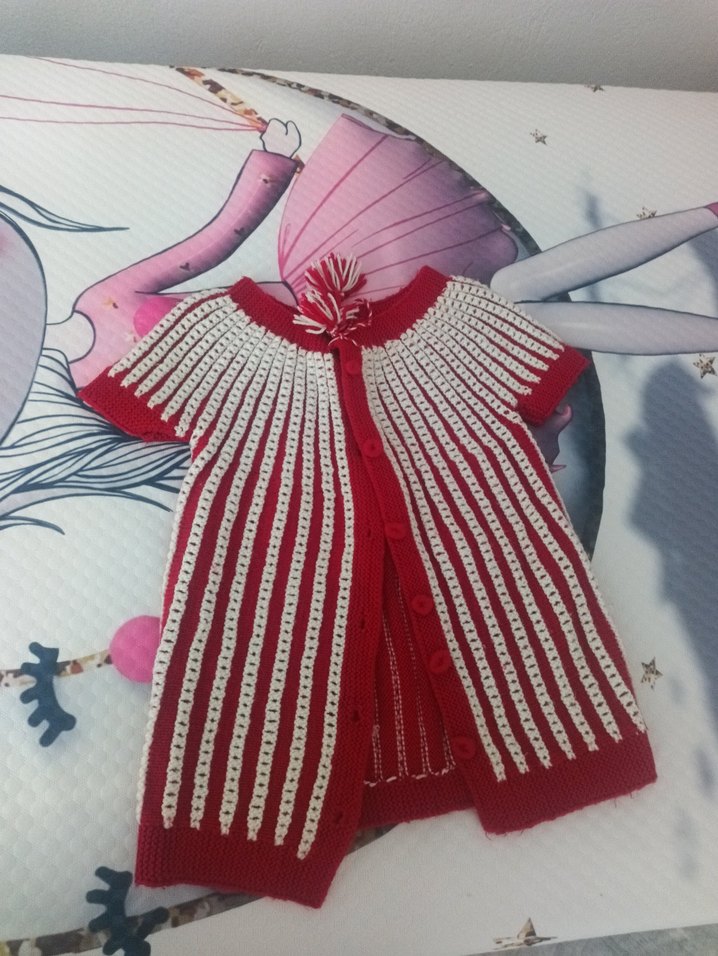 Nakışlı desenlere sahip, düğmeli ve kırmızı renkli, kolsuz, vücuda oturan triko yelek. Yumuşak triko kumaştan üretilmiştir. el örgüsü