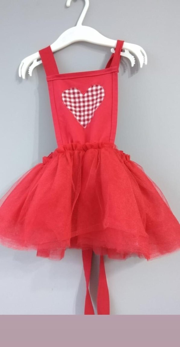 Kız çocuk elbisesi, canlı kırmızı renkte nakışlı kalp deseni ve kabarık tül etek detayına sahiptir. saç bandıda vardır askıları ayarlanabilir oldugu için 6 ay-3 yaşa kadar uyumludur