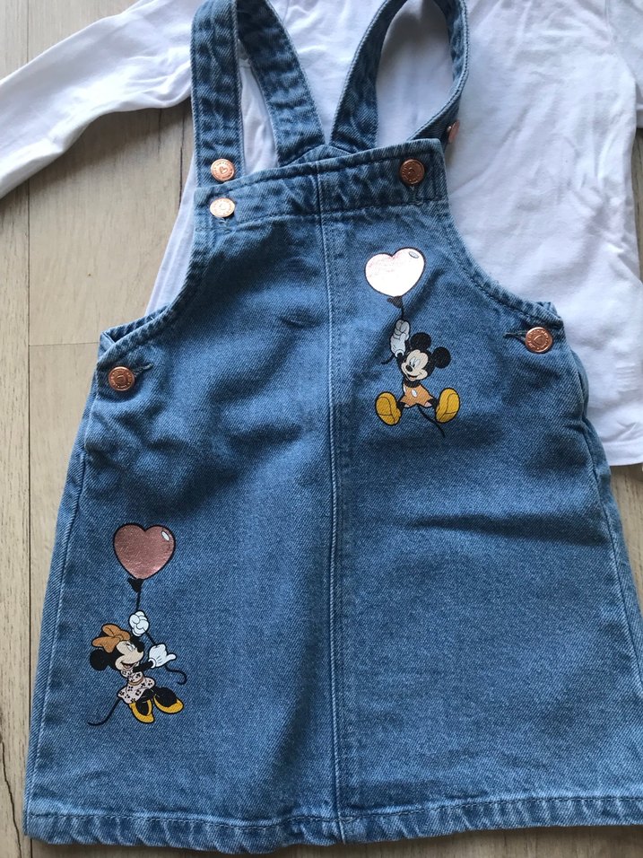 Düğmeli, nakışlı Mickey Mouse desenli kız çocuk kot elbise. Askılı ve yuvarlak yakalı, rahat kesim ve sokak stiline uygun. İç body dahil