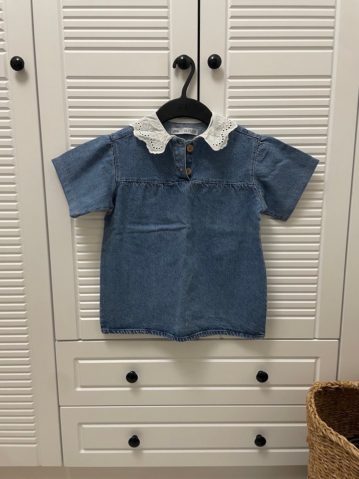 Nakışlı ve düğmeli yakalı, kısa kollu mavi kot kız çocuk elbisesi. Rahat kesimli ve günlük tarzda.
