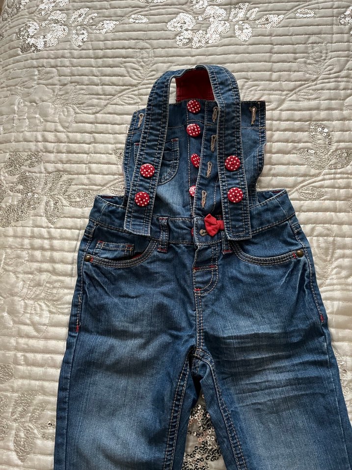 Düğmeli askılı, nakışlı kırmızı detaylara sahip kız çocuk kot salopet. Sıkı kesim ve counterculture tarzı ile dikkat çeker.