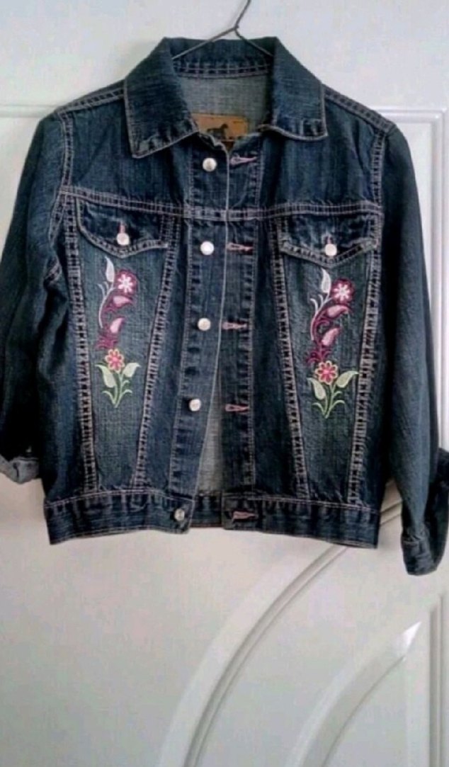 Koyu mavi renkli, nakışlı çiçek desenli, düğmeli ve kesimli bohem tarzda kız çocuk denim ceketi.