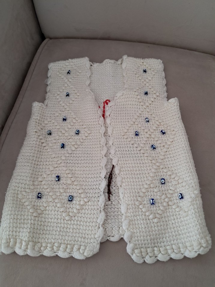 Kız çocukları için V yaka, nakışlı ve renkli detaylara sahip, beyaz örgüden yapılmış dar kesim kolsuz yelek. bebek ürünlerinde toplu satış yapıyorum.