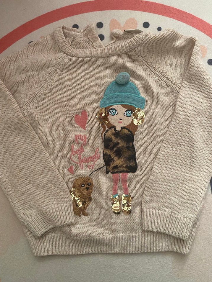 Kahverengi örgü kumaştan, bol kesim, uzun kollu ve bisiklet yaka kız çocuk kazak. Nakışlı kız ve köpek figürüyle sokak stiline uygun bir tasarım sunar.