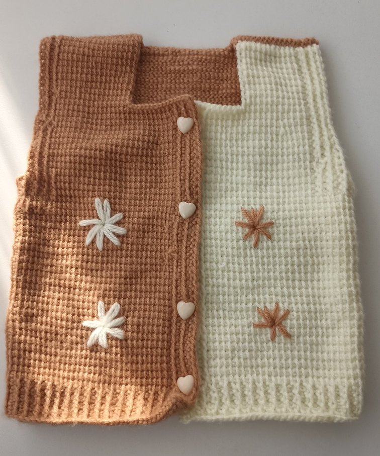 Nakışlı çiçek desenli, pastel bej tonlarında kız çocukları için kolsuz örgü yelekler. Bol kesim ve kalp şeklinde düğmeler içerir. el emeği göz nuru arayanlar için sıcacık bebek çeyiz lerinde eksik kalmasın