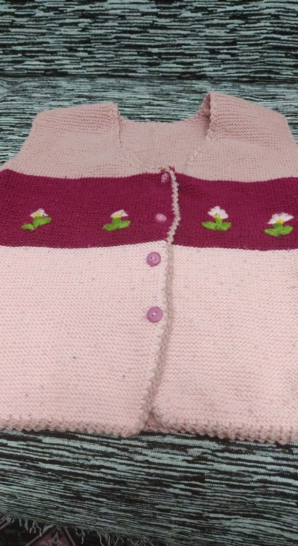 Nakışlı çiçek desenli, pastel pembe renkli, bohem tarzda, düğmeli, regular fit kız çocuk örgü süveter.