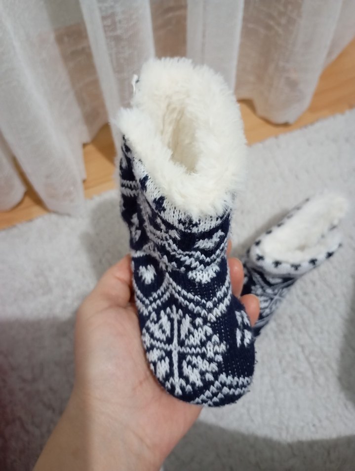 Kız çocukları için beyaz ve gri nakışlı örgü desenli, yumuşak tüylü iç astarlı sıcak ev terliği. 20 ,21 numara hıc gyılmedi marka temsili