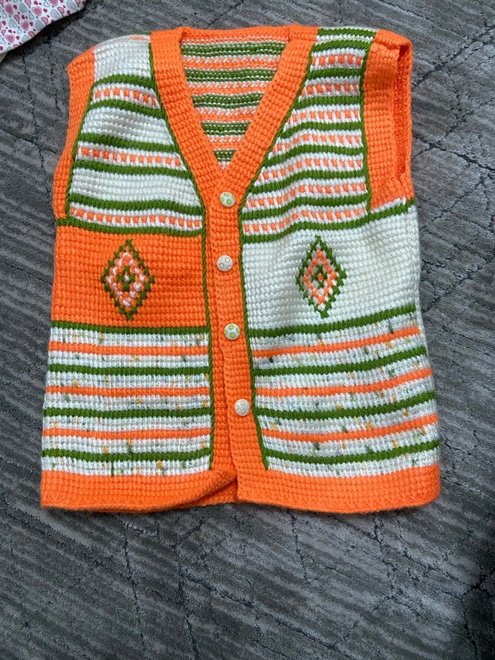Renkli, nakışlı desenlere sahip kız çocuk örgü yelek. Kolsuz, tekne yakalı ve bohem-retro tarzında, rahat kesim. İkisi 145 tl