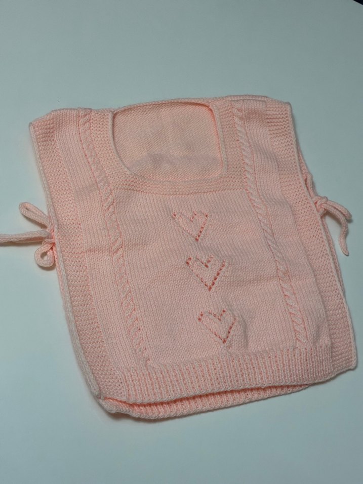 Nakışlı kalp desenli, pastel pembe renkli, kolsuz örgü kız çocuk süveteri. Yan bağcıkları ve bol bohem kesimiyle şık ve rahat.