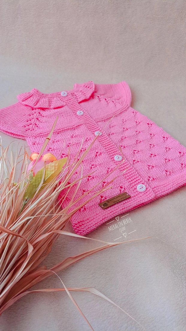 Pembe renkli, nakışlı, uzun kollu bohem tarzda kız çocuk triko hırka. Rahat kesimli ve yumuşak dokulu.