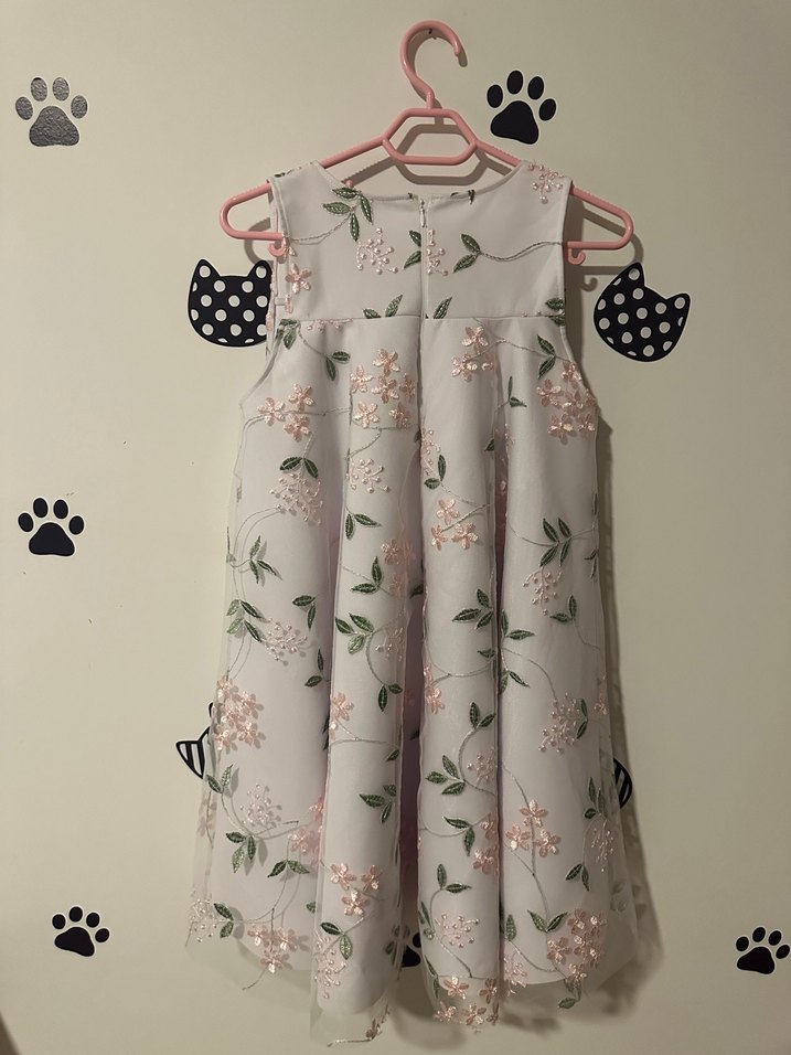 Nakışlı çiçek desenli, kolsuz kız çocuk elbisesi. Yumuşak sentetik kumaştan, pastel gri renkte, straplez yakalı ve pilili, bol kesim bohem tarzda. 1 defa giyildi ,özel dikim
