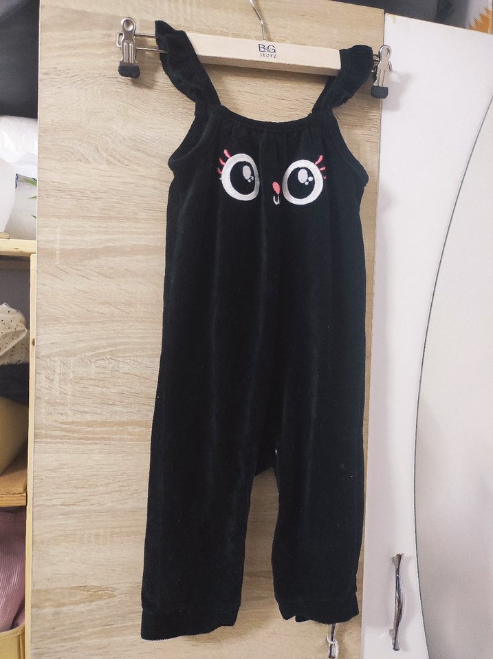 Yumuşak ve sıcak kumaştan, nakışlı göz detaylı, siyah örme, kolsuz ve bol kesim kız çocuk tulumu.