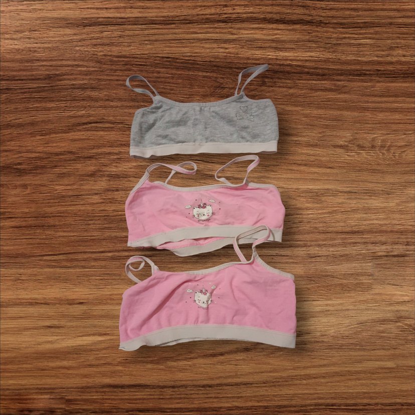 İnce askılı kız çocuk spor sütyenleri üçlü set halinde. İki pembe sütyen üzerinde nakışlı kedi deseni, gri sütyen sade. Yumuşak kumaş rahatlık sağlar. 2 tanesi 9-10 yaş, 1 tanesi 11-12 yaş.