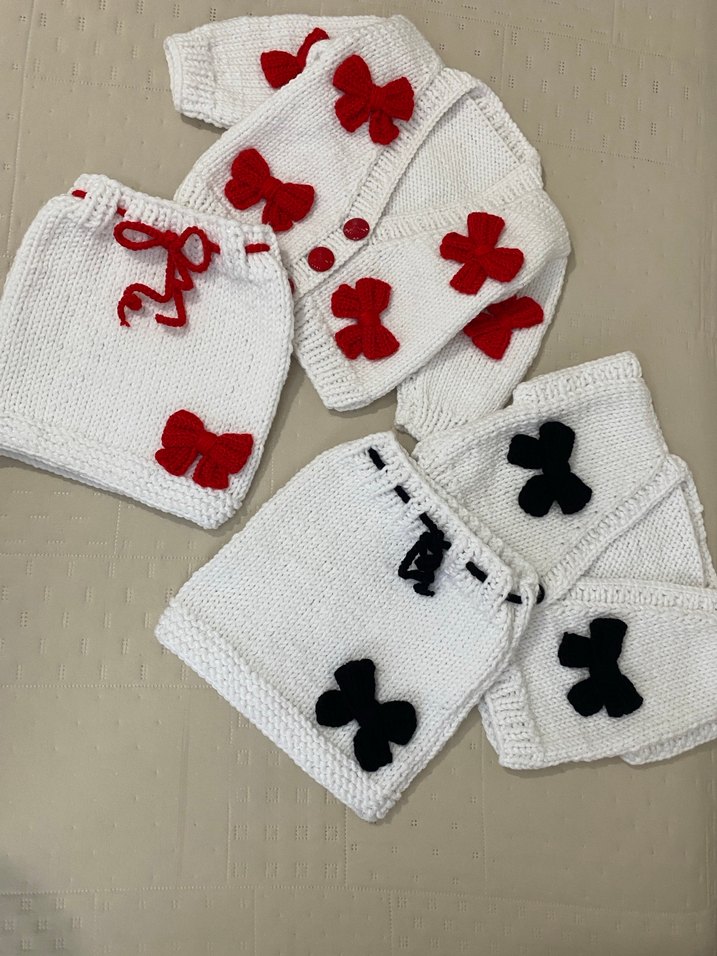 Beyaz renkli, nakışlı renkli fiyonk detaylı kız çocuk triko hırka ve etek takımı. Dar kesim uzun kollu hırka düğmeli, etekler bağcıklı. Streetwear tarzı için uygun. (Adet fiyatıdır)