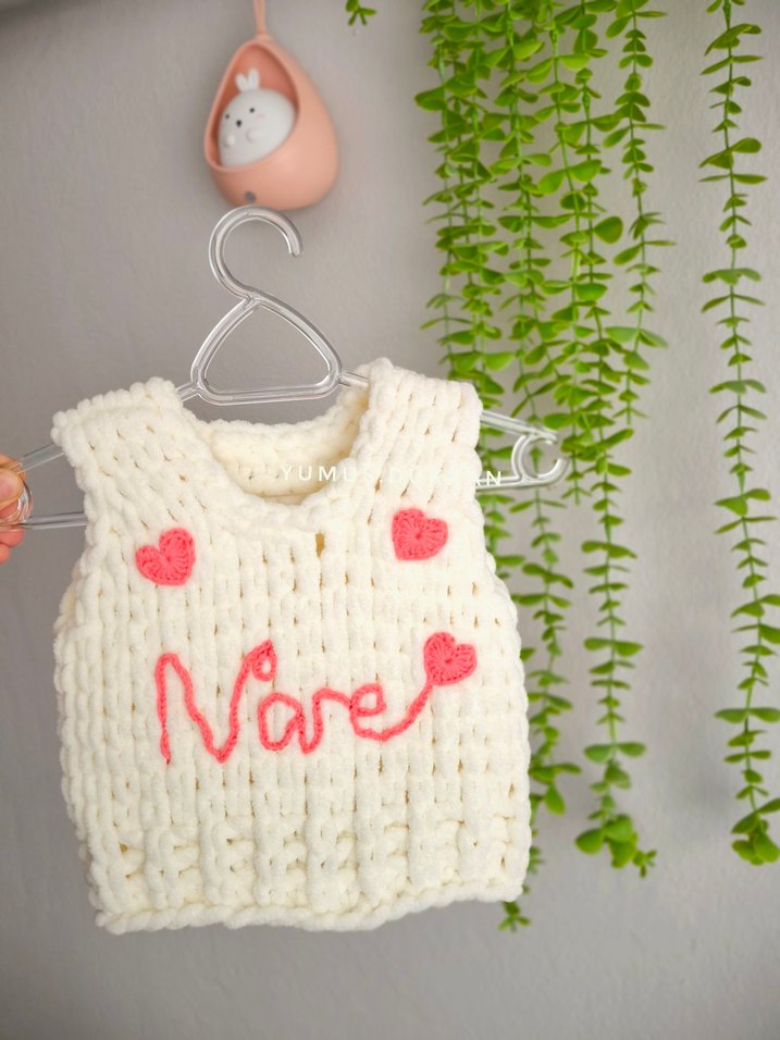 Yumuşak triko kumaştan, bol kesim kız çocuk yeleği. Beyaz, bisiklet yaka, nakışlı pembe kalpler ve yazı detaylı. isme özel bir şekilde hazırlanır. görseldeki ürün 6 ay için hazırlanmıştır isteğe göre her yaşa uygun bir şekilde hazırlanır.