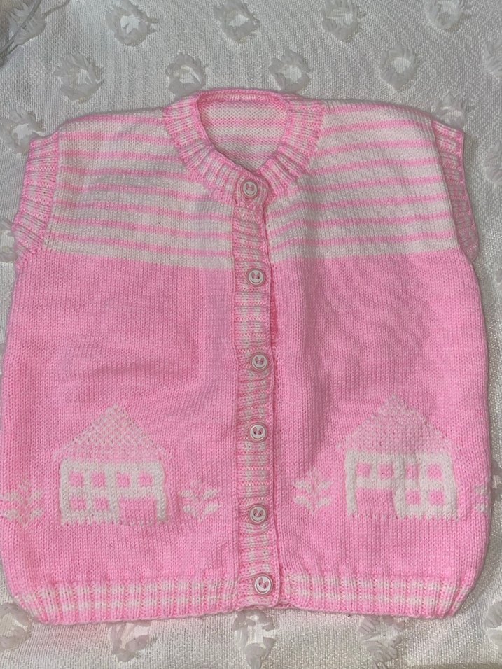 Düğmeli, nakışlı desenlere sahip, pembe renkli kolsuz triko süveter, bol kesimle rahat kullanım sağlar.