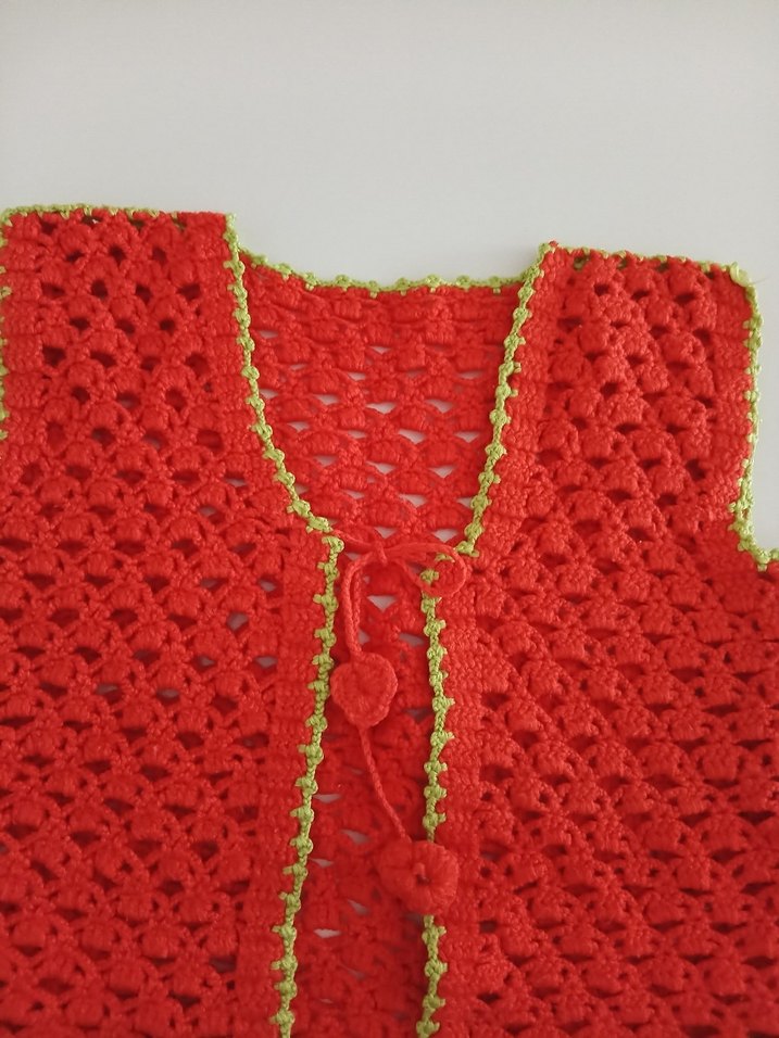 Renkli örgü yelek, kız çocukları için V yaka ve kolsuz tasarıma sahip, nakış detayları ve bol kesimi ile bohem ve retro tarzını yansıtıyor.