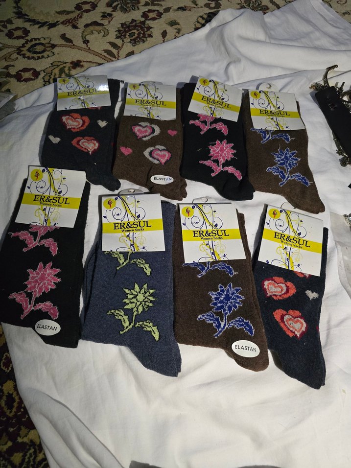 Adet fiyatı için koyu renkli, yün malzemeden üretilmiş nakışlı çoraplar. Çiçek ve kalp desenleriyle süslenmiş, yumuşak ve sıcak tutar.