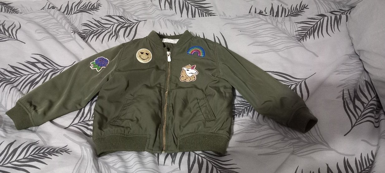 Kız çocukları için fitted kesim, fermuarlı, nakışlı gökkuşağı, unicorn ve gülen yüz detaylı sentetik kumaş ceket. Sadece kol ağızlarında tıftıklnme var