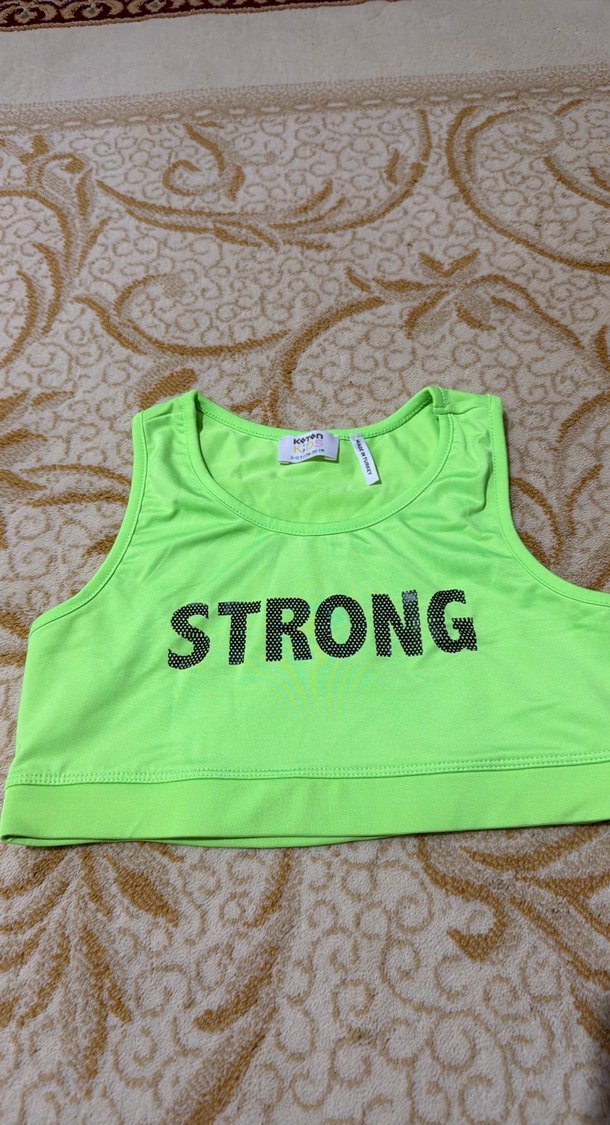 Kız çocukları için neon yeşil, straplez, kolsuz, vücuda oturan spor atlet. Üzerinde "STRONG" baskısı ve cırt cırt detay bulunur. Street wear tarzına uygundur.