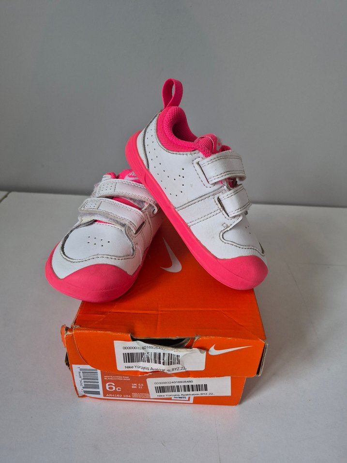 Beyaz ve pembe renklerde, renkli baskılı kız çocuk spor ayakkabılarıdır. Kauçuk tabanlı ve cırt cırtlıdır, sokak stili için uygundur. Orijinal Nike marka spor ayakkabı