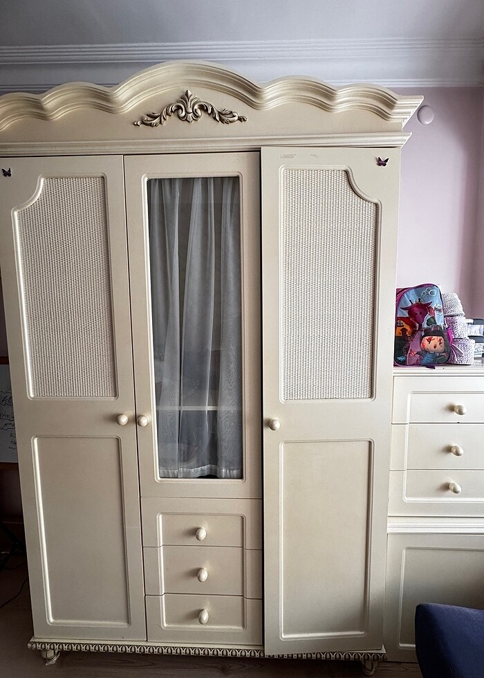 Çocuk odası için mobilya satılmaktadır. Setin içinde: yatak, giysi dolabı ve 4 küçük dolap bulunmaktadır. Yatak, kenarlarına koruma aparatı eklenerek yeni doğan bebeğin düşmesini önlemek için dönüştürülebilir. Ayrıca, daha büyük çocuklar için de yatak olarak yeniden düzenlenebilir. İki adet yatak minderi mevcuttur. Küçük minderin boyutları: uzunluk 130 cm, genişlik 80 cm. Büyük minderin boyutları: uzunluk 176 cm, genişlik 81 cm. Alt kısımda bir çekmece bulunmaktadır, buraya küçük minderi koyarak iki çocuk için uygun bir yatak elde edebilirsiniz. Mobilyalar kaliteli ve normal durumda, biraz küçük çizikler var. Gönderim yapmıyoruz, ödeme sonrası gelip almanız gerekmektedir.