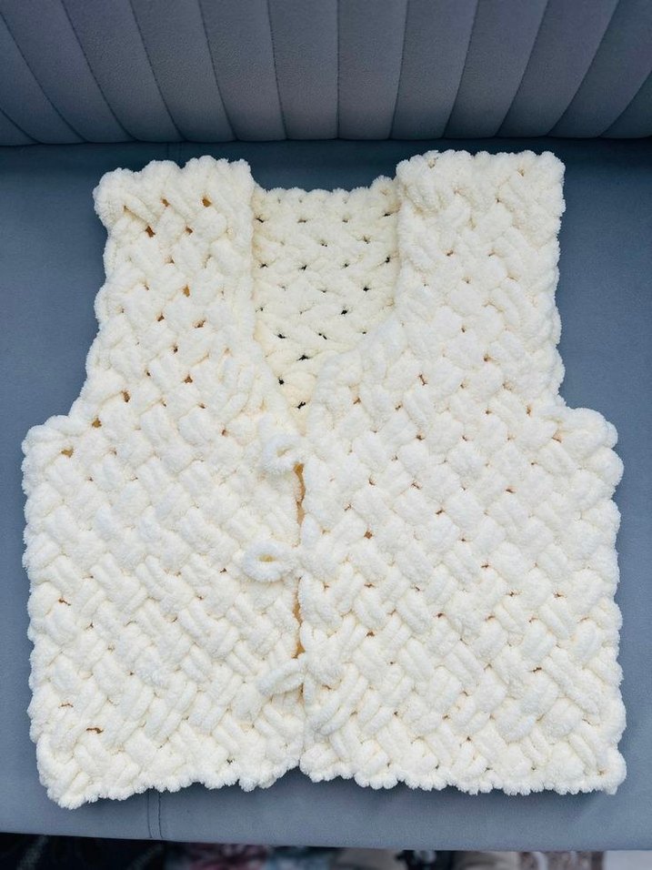 Bu kız çocuk yeleği, beyaz örgü tasarımı, V-yaka ve kolsuz stiliyle, pastel tonlarda ve bohem tarzında, vücuda oturan bir yapıya sahiptir.