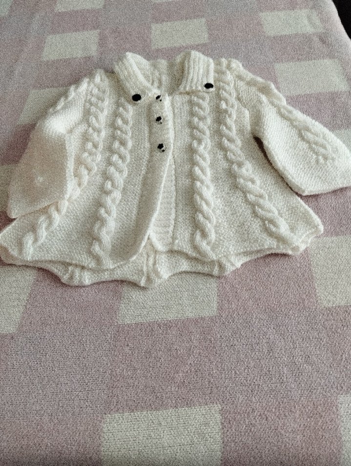 Uzun kollu, bol kesim, geleneksel tarzda beyaz örgü kız çocuk hırkası. Siyah düğmeli ve yumuşak dokulu.