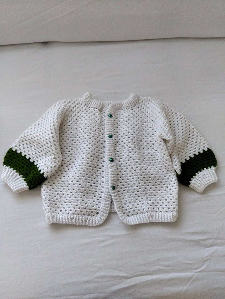 Uzun kollu, bol kesim beyaz örgü kız çocuk hırkası, manşetlerde yeşil şerit detaylıdır. Düğmeli ve desensiz sade bir tasarıma sahiptir.