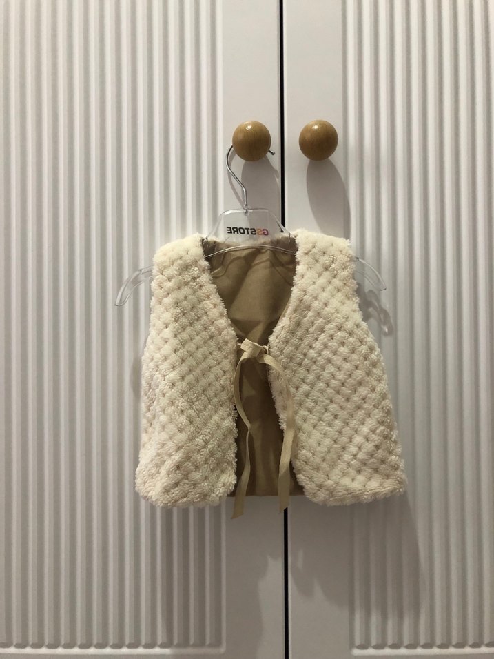 Örgü dokuma, kolsuz, kesik yaka detaylı, bohem tarzda, beyaz renk kız çocuk yeleği. Önden bağlamalı, dar kesim model. 2 li