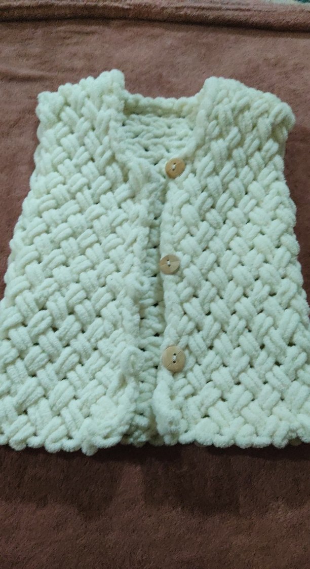 Kız çocukları için düğmeli, bohem tarzda, beyaz pastel renkli, boğazlı ve kolsuz örgü yelek. Fitted kesim ve yumuşak dokuya sahip.el örgüsüdür