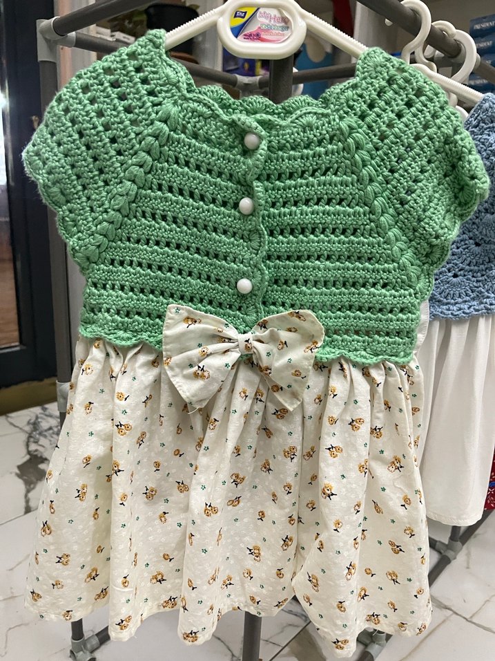 Kız çocuk elbisesi, kısa kollu yeşil örgü üst ve straplez yaka ile, çiçek desenli bol kesim etek ve fiyonk detayına sahiptir. 2-2.5 yaş için uygundur Annemin el emeği