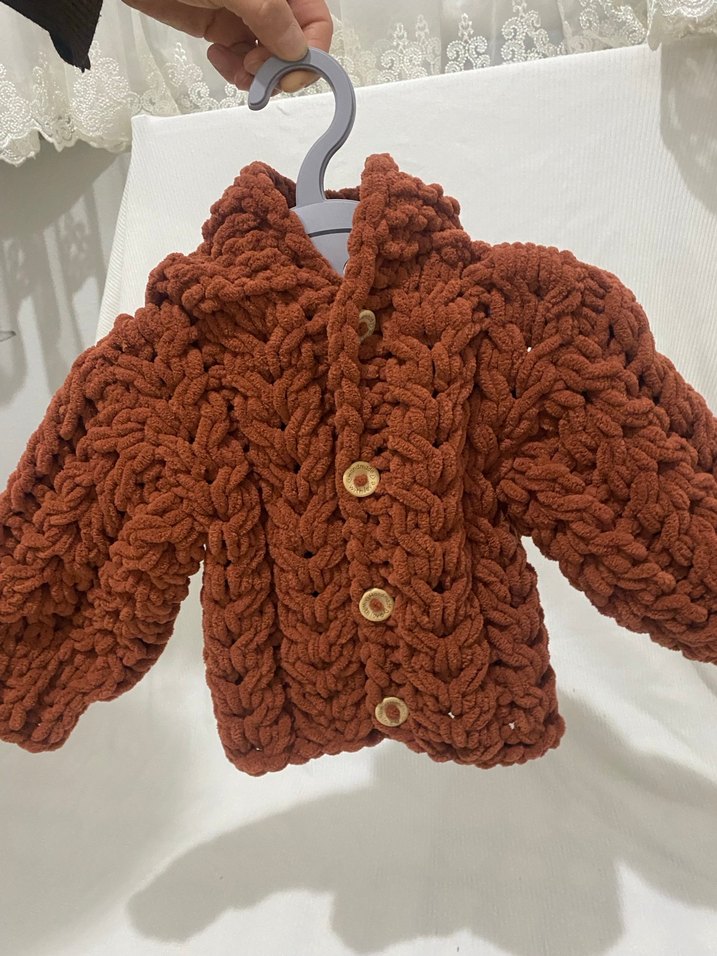 İstenilen ebatta çalışılır Koyu kahverengi, uzun kollu, vücuda oturan bohem tarzda kız çocuk örgü hırka. Kalın örgü dokusu ve ahşap düğmeler bulunur.